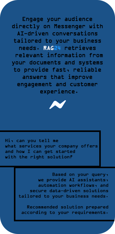 RAG24 delivers consistent, AI-driven replies on Facebook Messenger using your knowledge base, ensuring reliable engagement.